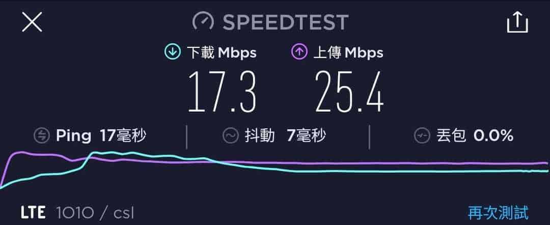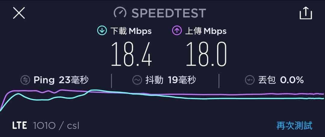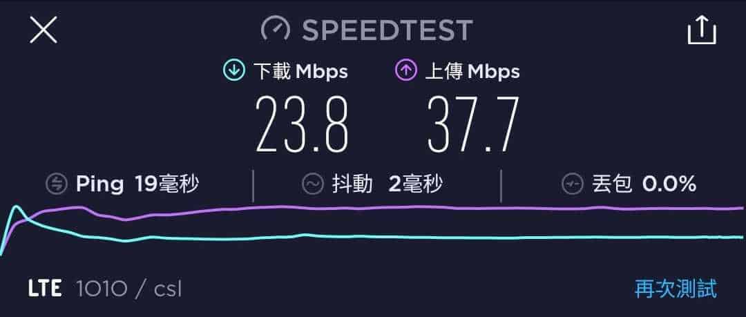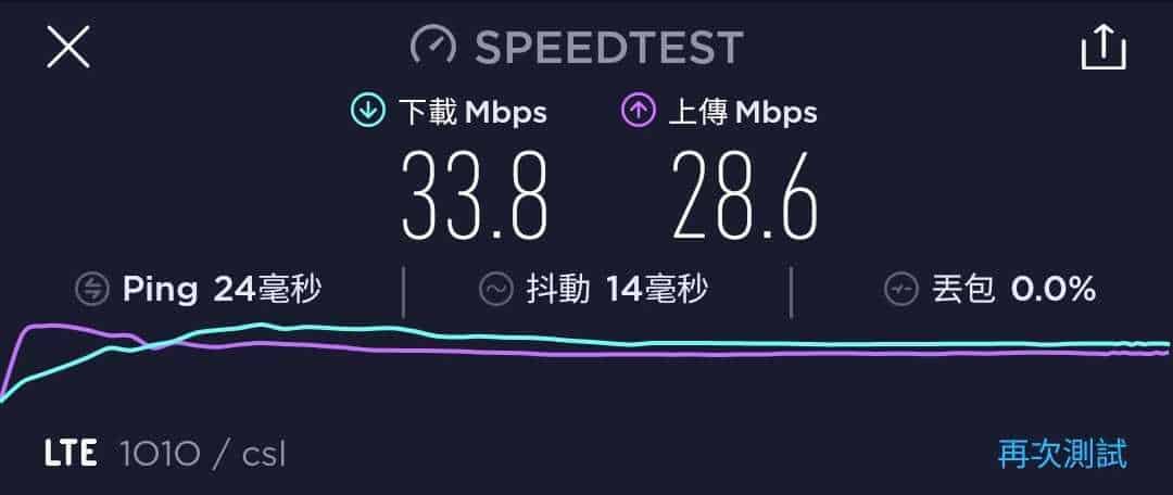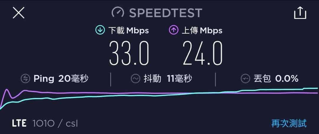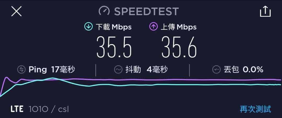 MORE Mobile 作為一張最高速度為 200Mbps 的年卡,速度測試一共進行了六次,大多間都是維持在 23.8Mbps 至 35.5Mbps 下載,及 24Mbps 至 37.7Mbps 上載。不過也有出現下載與上載速度僅達 18Mbps 的情況。