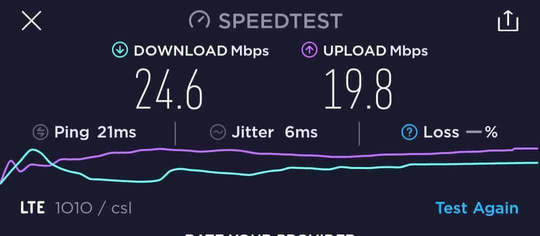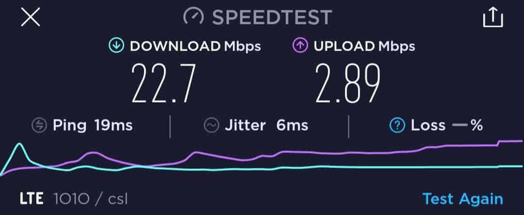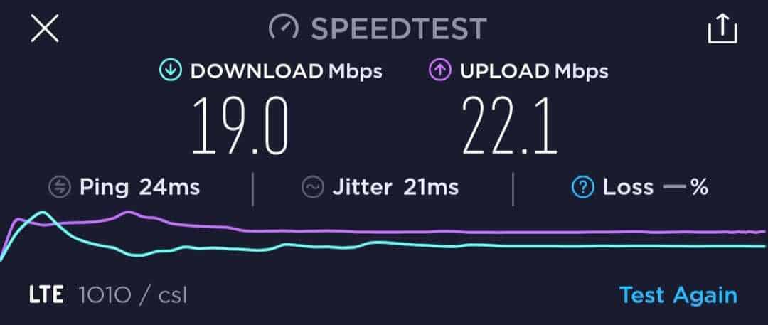 Lucky SIM 作為一張最高速度為 21Mbps 的年卡,速度測試一共進行了四次,大多間都是維持在 19Mbps 至 22.9Mbps 下載,及 19.8Mbps 至 22.1Mbps 上載,與說明的相符沒有數據速度不足問題。不過也曾經出現了過低上載速度的 1.7Mbps 與 2.89Mbps。