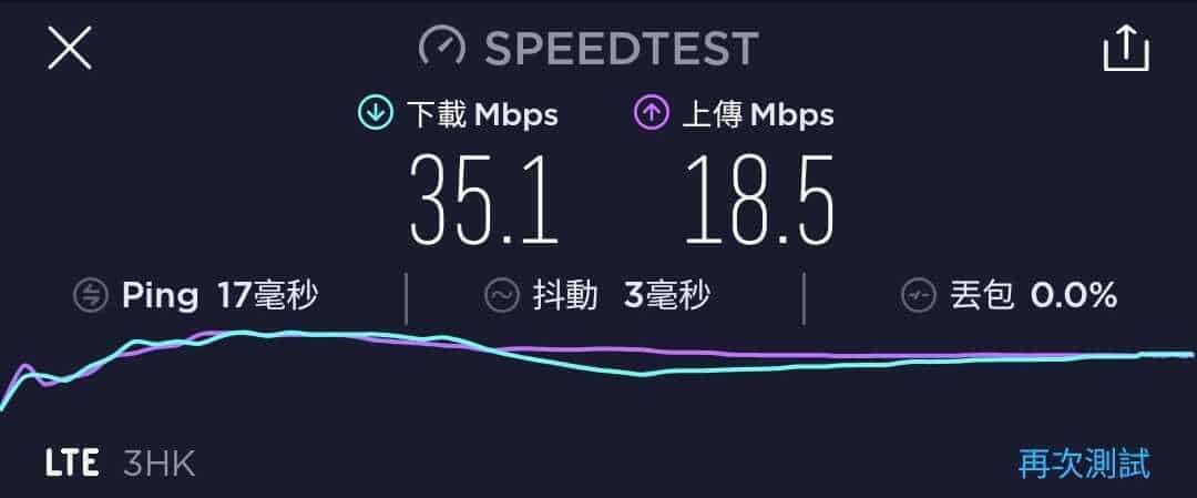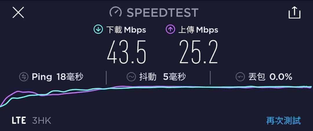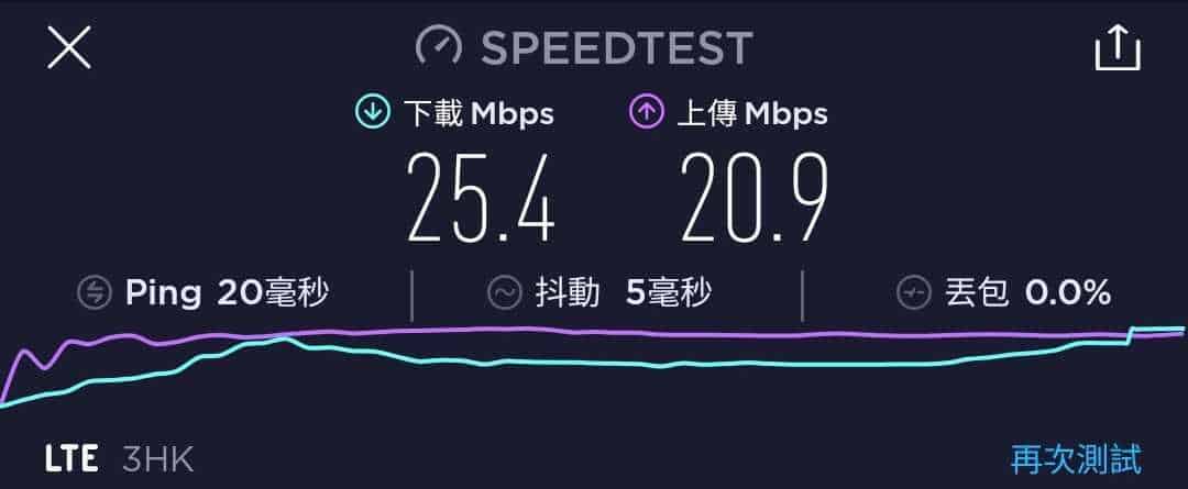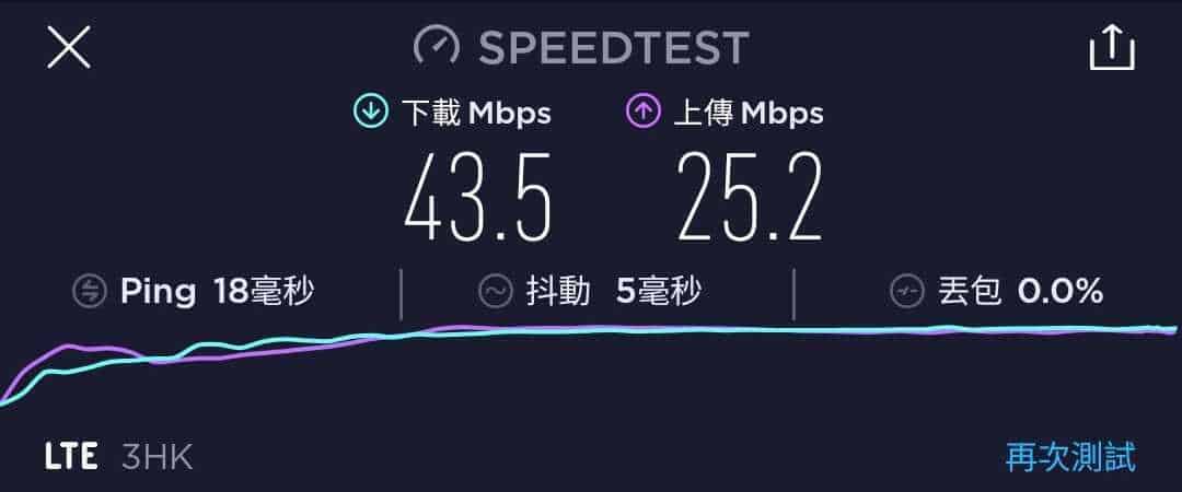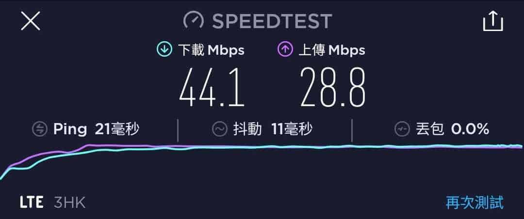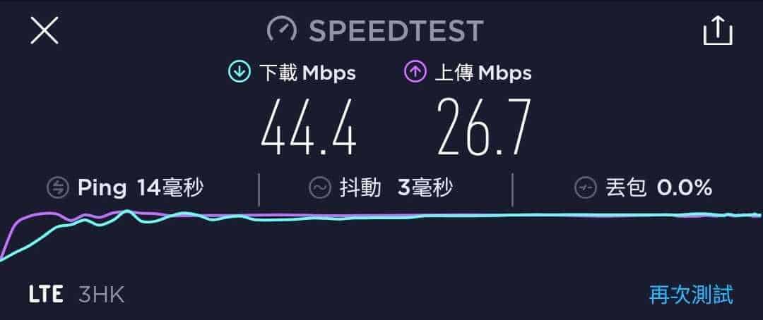 3香港 國際萬能卡作為一張最高速度為 42Mbps 的年卡,速度測試一共進行了五次,大多數時間都是維持在 25.4Mbps 至 44.4Mbps 下載,及 18.5Mbps 至 28.8Mbps 上載。下載速度與說明的差不多,但上載速度則有點可惜。