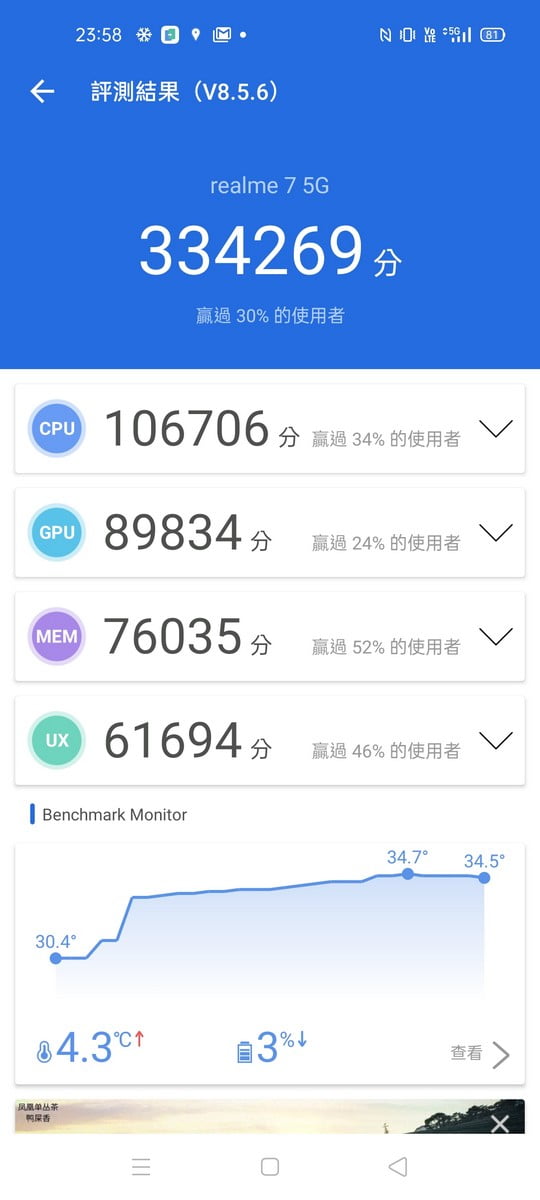 oppo realme 7 5G 採用 Dimensity 800U CPU、8GB RAM 及 128GB ROM,Antutu 跑分是 334,269 分,是個中階機的成績。