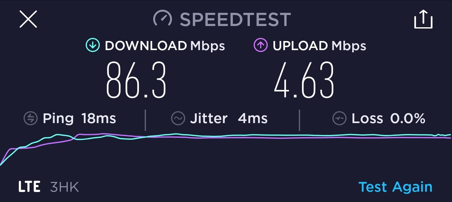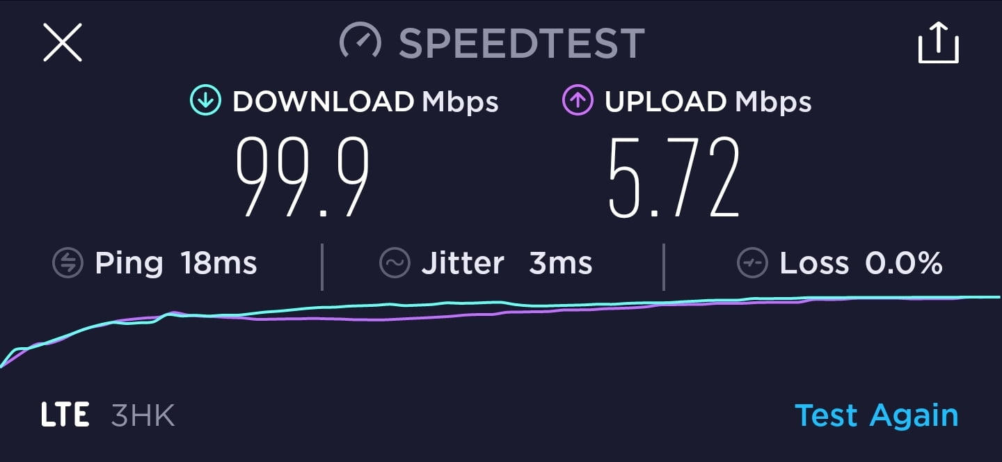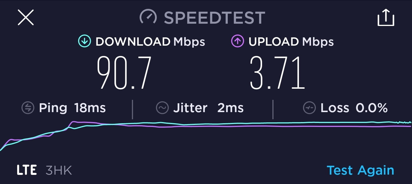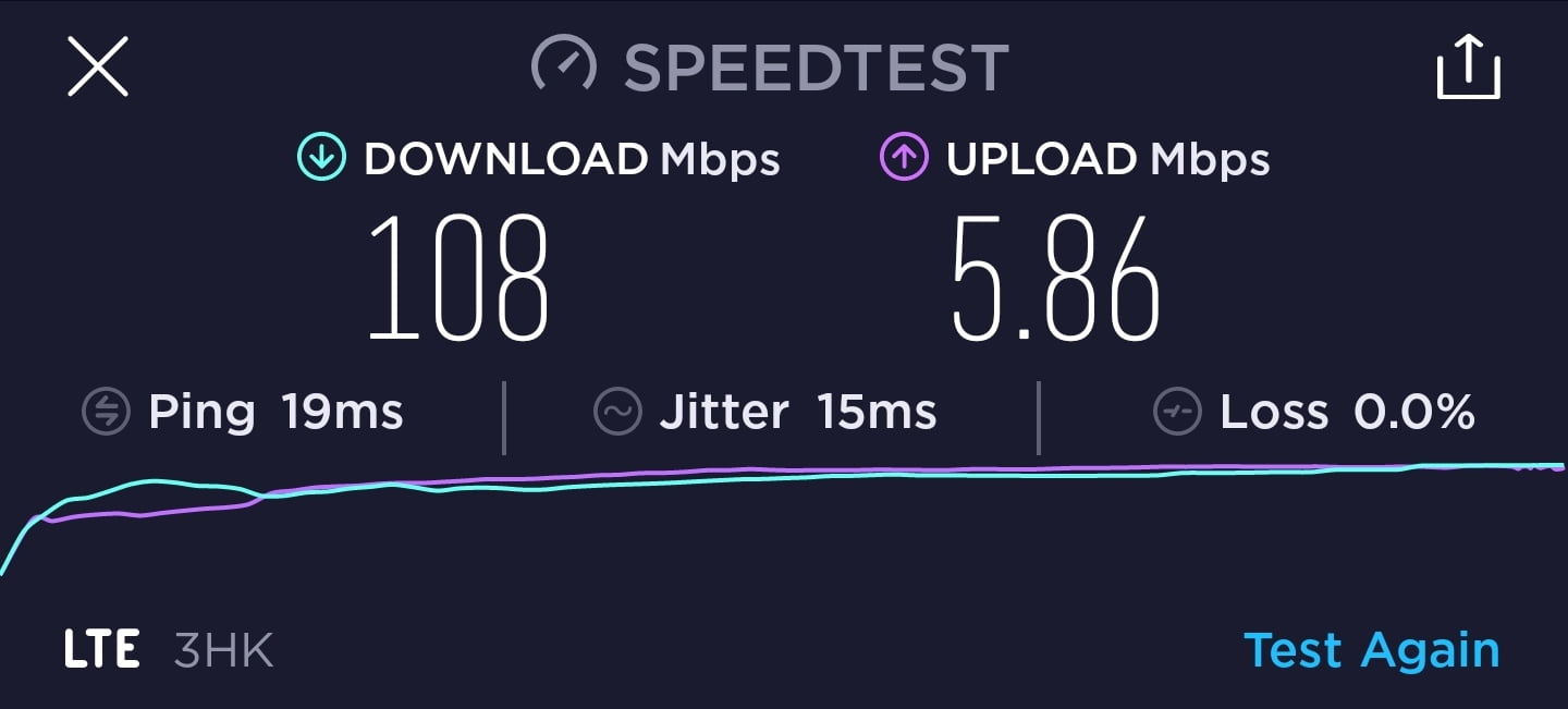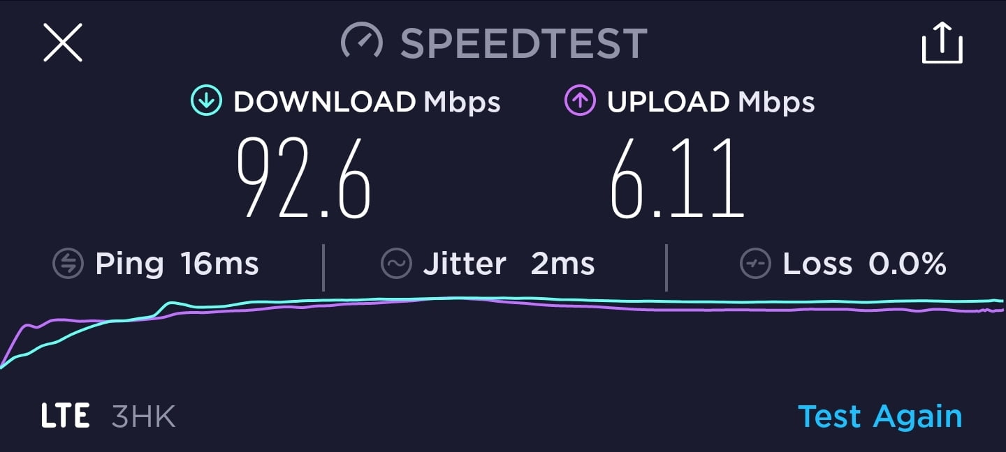 3香港 DIY 儲值卡作為一張標榜最高速度為 1.1Gbps 的月卡,速度測試一共進行了 7 次,大多數時間都是維持在 90Mbps 下載及 5Mbps 上載,其中一次則是有達到 6.11Mbps 上載。下載速度與說明的有一定差異。