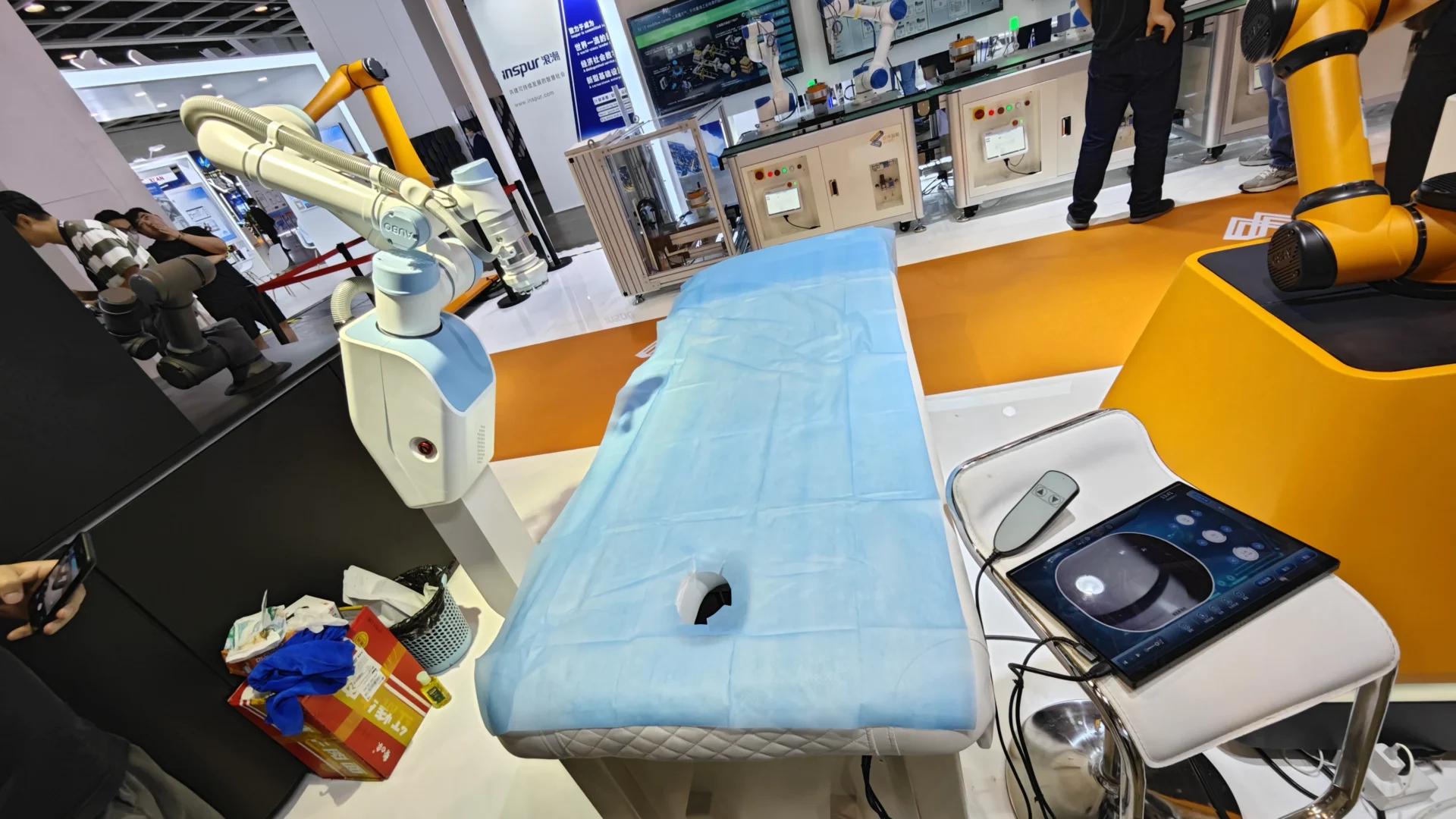 AUBO 機械人公司最新研發出的 協作機械人,可以落地成為一個自動化的按摩系統,為用戶提供個性化、精準的機械人按摩服務。AUBO 協作機械人配備 3D結構光掃描技術,10秒內即可掃描用戶的背部形狀,精度可達±3毫米。機械人會根據掃描結果,規劃出合適的按摩路線,並利用按摩圓球在用戶背部進行按摩。用戶可以自行控制按摩力度、熱量及時間,實現定制化服務。