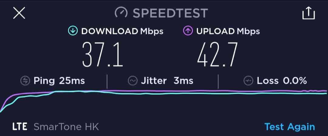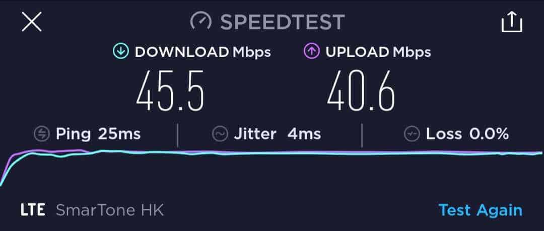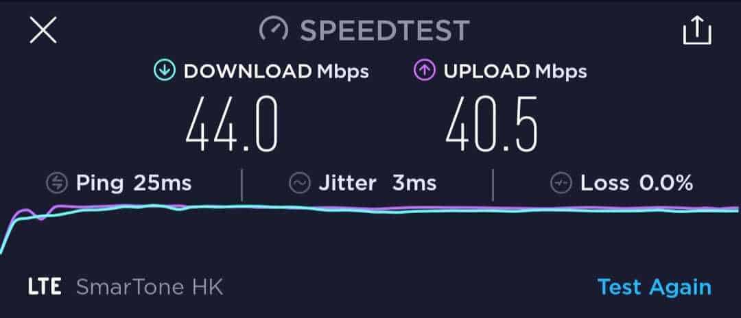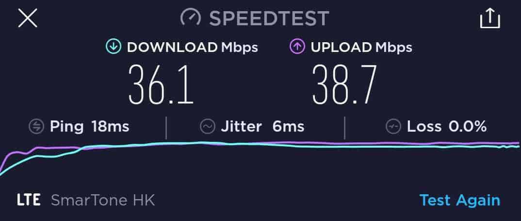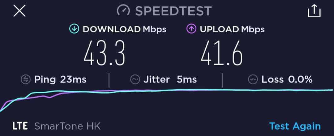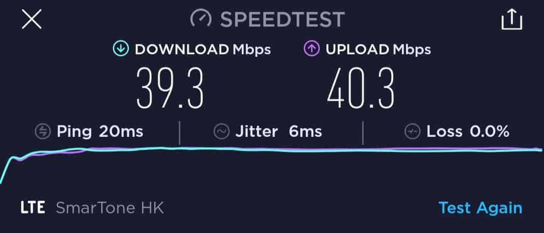 雖然 激 ValueGB 在卡套的說明上沒有標示是否限速,但我們還是進行了六次速度測試,但可能受測試地點所限,速度在 42Mbps 左右。六次的下載速度在 36.1Mbps 至 45.5Mbps 之間,而上載則是 38.7Mbps 至 42.7Mbps。