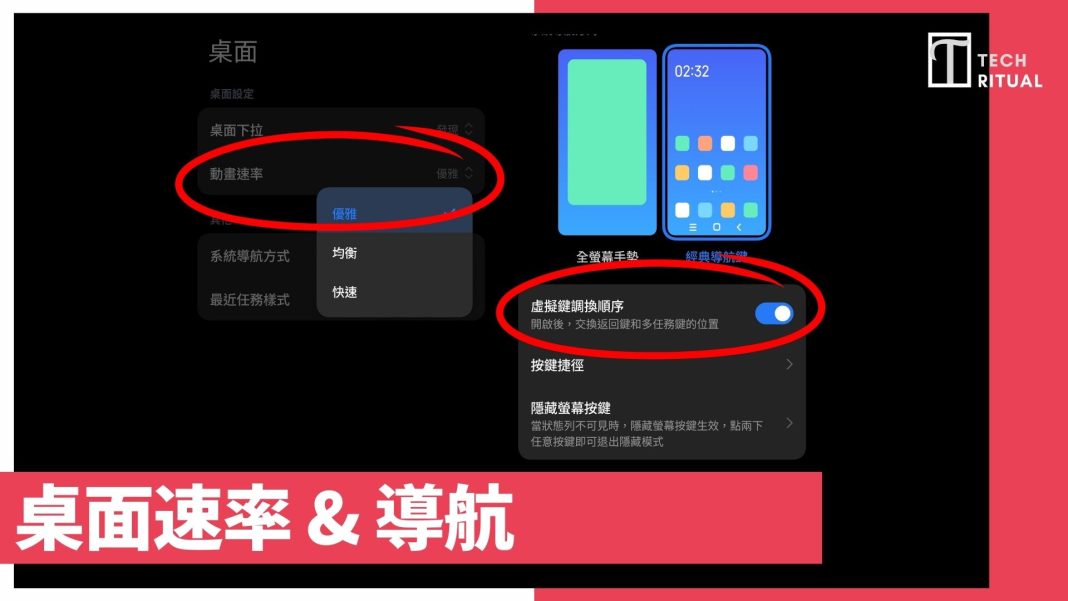選擇「設定」,再選擇「桌面」,裡面的「動畫速率」,預設是優雅,但選擇「快速」,可以減少動畫,讓手機速度更快,令新手機感覺更快速。另外,如果你不習慣手勢操控,可以選擇下方的「系統導航方式」,然後選擇「虛擬鍵調換順序」,把傳統的三導航鍵帶回來。