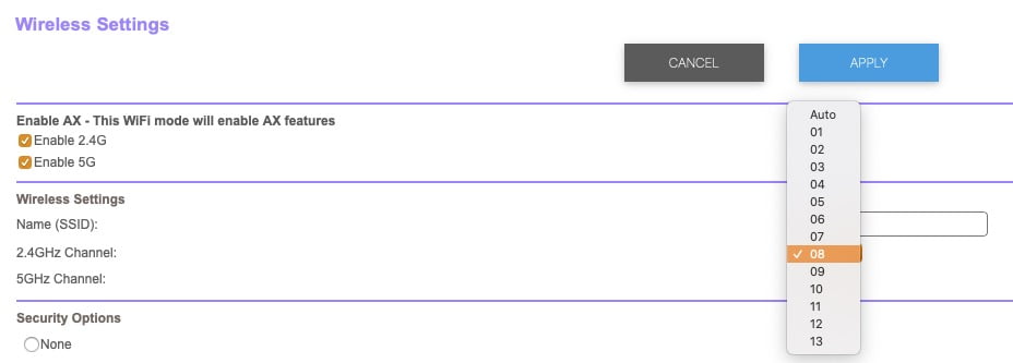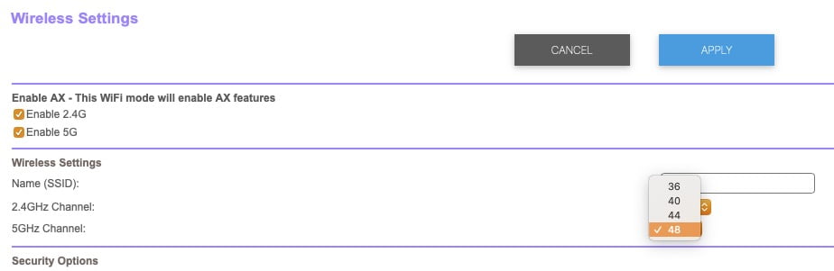 當你知道周遭的 WiFi 訊號後,可以進入自己的 WiFi Router 設定,選擇 2.4GHz 與 5GHz 的 Channel 來避開擁擠位置。例如我們使用這個 orbi 無線路由器管理頁面,可以看到 Wireless Settings 裡可以選擇 2.4GHz 與 5GHz 使用什麼 Channel。例如這裡在 2.4GHz 就使用 Channel 8,5GHz 則使用 Channel 48。