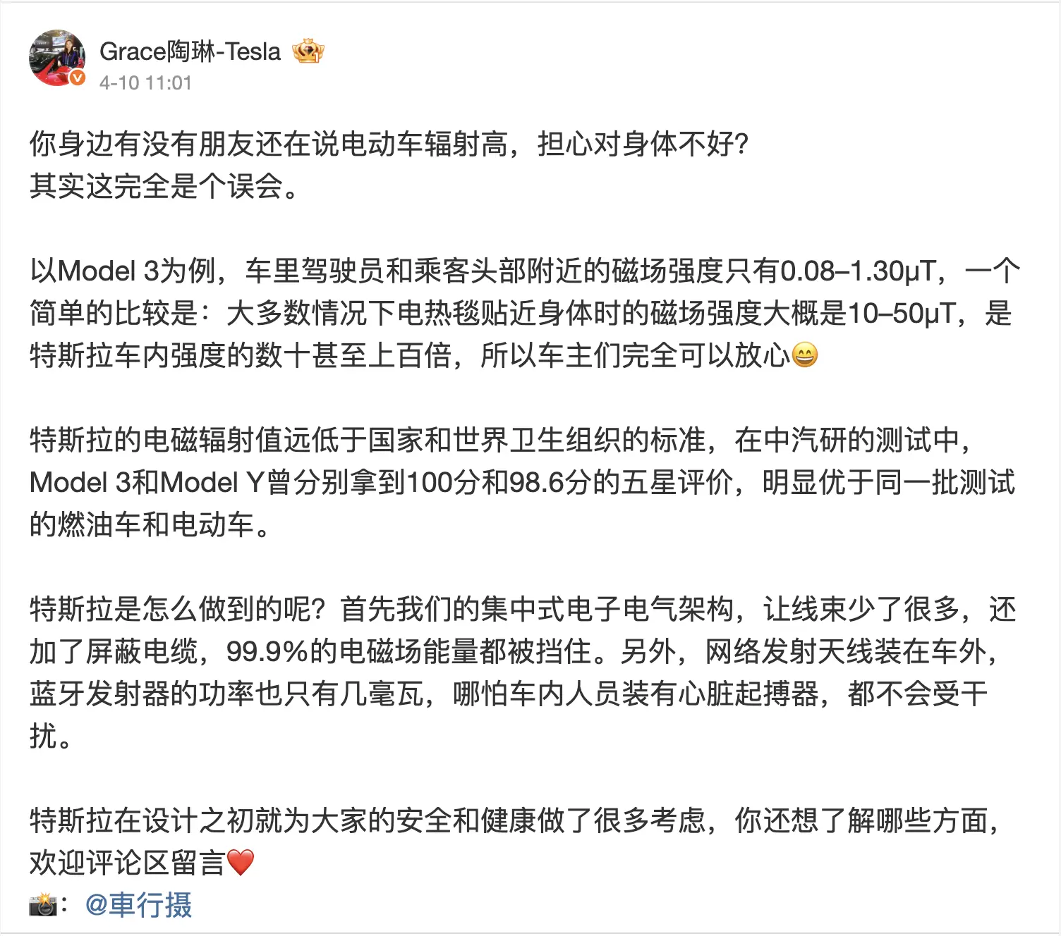 Tao 在她的發文中表示:「以 Model 3 為例,車內駕駛者和乘客頭部附近的磁場強度僅有 0.08-1.30μT,而靠近人體的電熱毯磁場強度一般在 10-50μT 之間,這是 Tesla 車內強度的十倍甚至百倍,因此車主可以放心。」