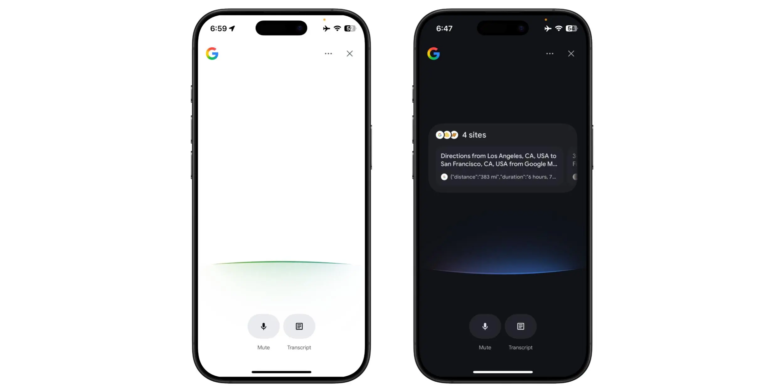 全屏界面提供淺色或深色背景,左上角顯示新的「G」標誌。界面中有一個弧形波形圖,顏色與 Google 標誌相符,而藥丸形按鈕則提供「靜音」和「逐字稿」的選項。目前,「逐字稿」按鈕僅能打開 AI 模式的對話,無法顯示實時字幕。