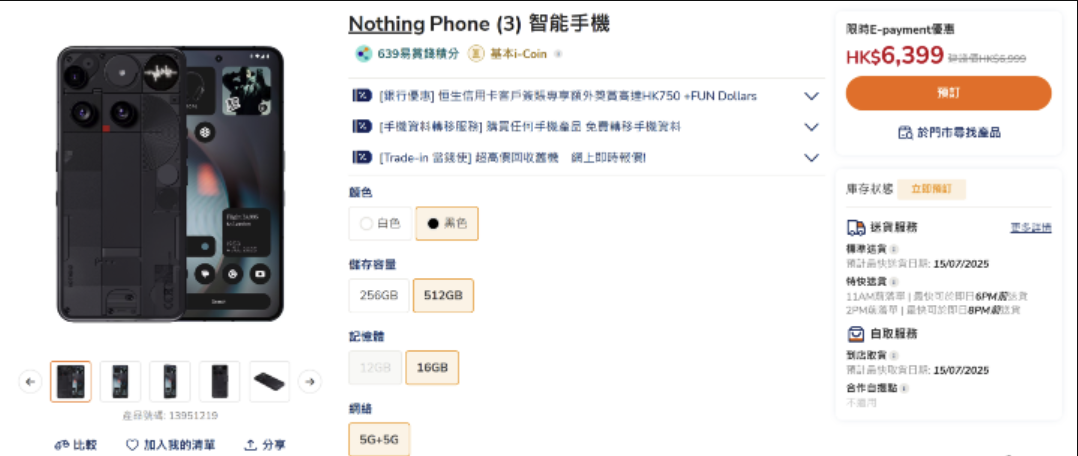 Nothing Phone (3) 是今年最受期待的手機之一,香港也終於正式公開,版本上有 12GB + 256GB 及 16GB + 512GB 兩個版本,售價分別係 $6,399 及 $6,999,但依家有早鳥優惠,即使你買 12GB + 256GB 版本,俾 $6,399,都可以免費升級至 16GB + 512GB 版本!真係有埋襯手~