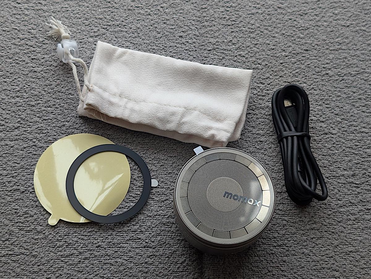 1-Snap Go 的包裝設計簡潔而時尚,內部配件包括支架本體、磁性貼片套件、USB-C to USB-C 充電線、收納袋以及說明書及保用證。支架本體的外觀採用高貴金屬質感外殼,搭配鋼化玻璃,散發出一種精緻的現代感。
