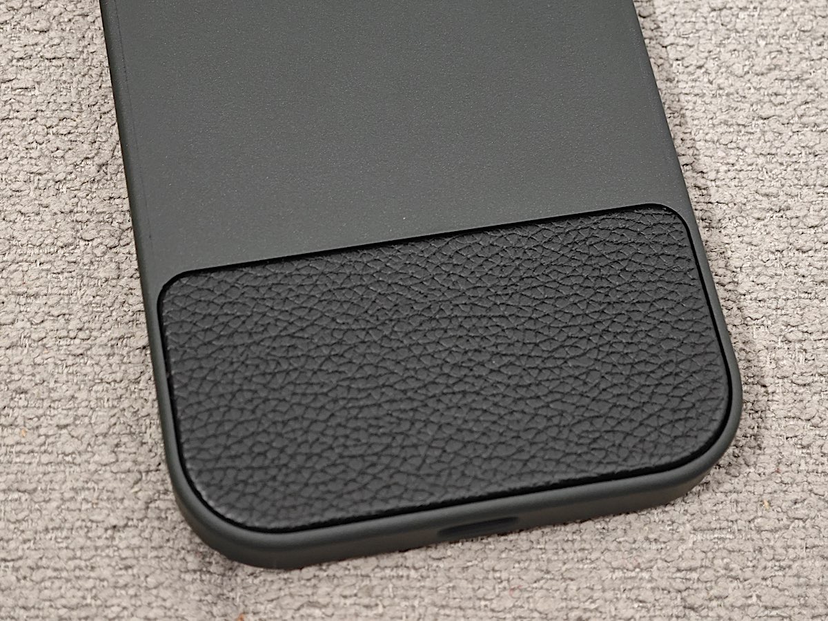 • 手機殻背後下部則有一個皮革的設計,這個設計可以說是超好,可以增加摩擦感,令手持時更穩。