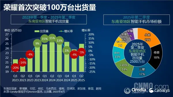 8月13日,有機構公布了東南亞地區手機出貨數據。數據顯示,2025年第二季度東南亞智能手機市場同比下降1%,出貨量為 2,500 萬台。小米憑藉 Redmi 系列的高銷量及渠道覆蓋面的擴張,時隔四年首次重奪榜首,這是自 2021 年第二季度以來的首次。