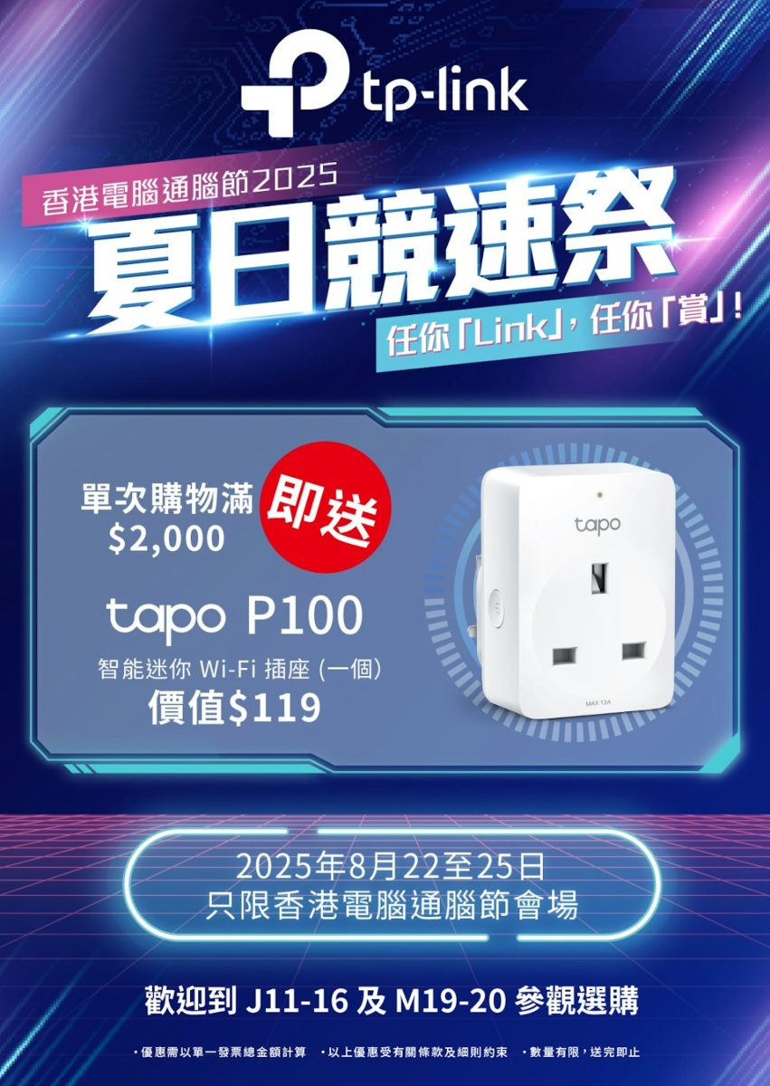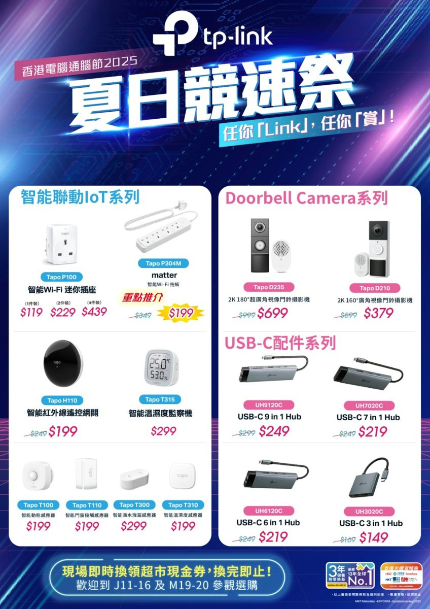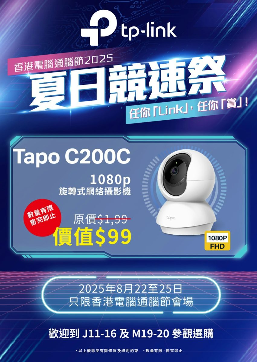 TP-Link 今年於「香港電腦通訊節 2025」帶來夏日競速祭,涵蓋極高清 4K IP CAM 系列、智能 IoT 裝置、門鈴攝影機、USB-C 配件、Wi-Fi 7 路由器,以及全屋覆蓋 Mesh 套裝等,會場限定勁減優惠低至 $99,更有購物滿額送智能插座、即場換領超市現金券等多重禮遇。無論是家居保安、網絡升級,還是智能生活配件,現場 J11-16 及 M19-20 攤位都可找到最抵選擇。