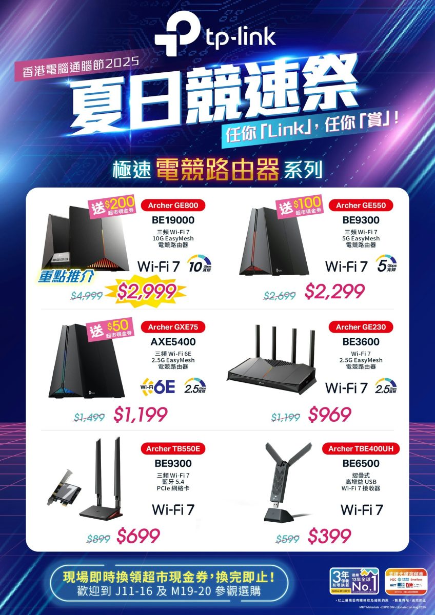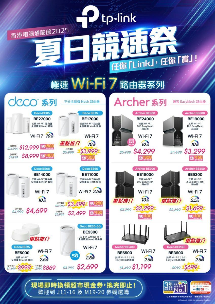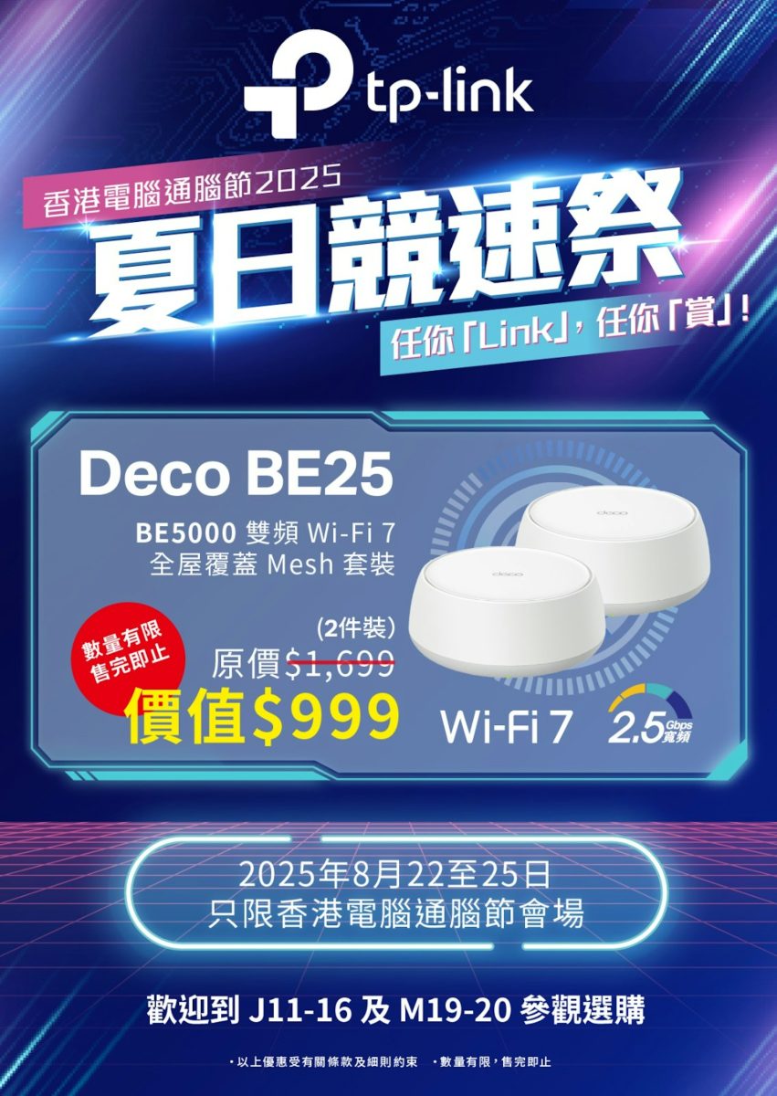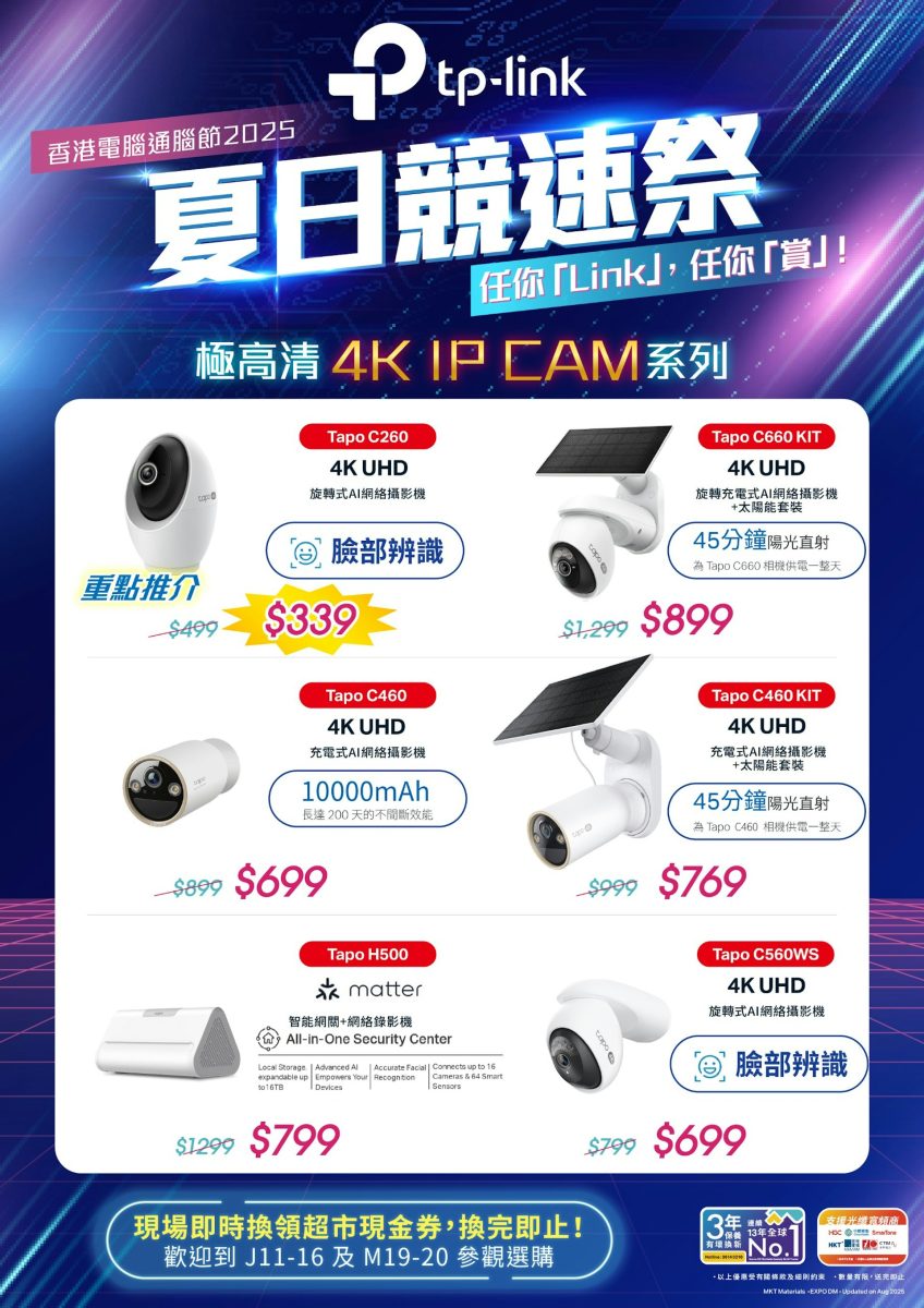 TP-Link 今年於「香港電腦通訊節 2025」帶來夏日競速祭,涵蓋極高清 4K IP CAM 系列、智能 IoT 裝置、門鈴攝影機、USB-C 配件、Wi-Fi 7 路由器,以及全屋覆蓋 Mesh 套裝等,會場限定勁減優惠低至 $99,更有購物滿額送智能插座、即場換領超市現金券等多重禮遇。無論是家居保安、網絡升級,還是智能生活配件,現場 J11-16 及 M19-20 攤位都可找到最抵選擇。