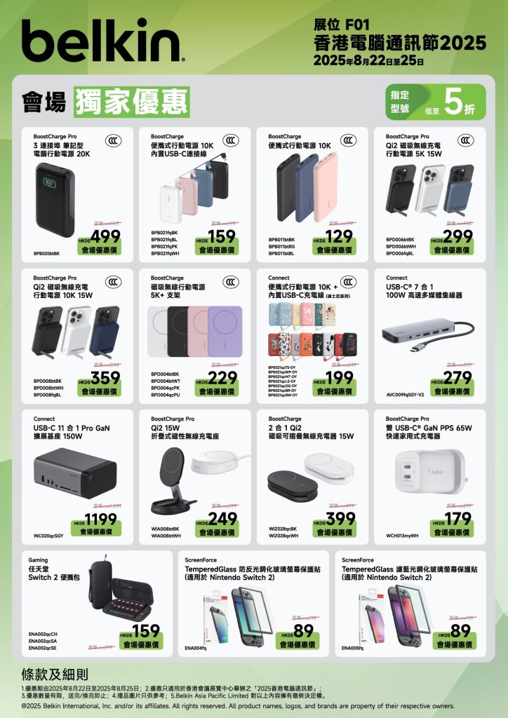 Belkin 已經公布展會期間,凡於攤位選購 Belkin 產品,將可享有折扣優惠,指定產品更低至 5 折。其中最平嘅係 $89嘅 Switch 2 保護貼,及 $129 的便攜式行動電源。