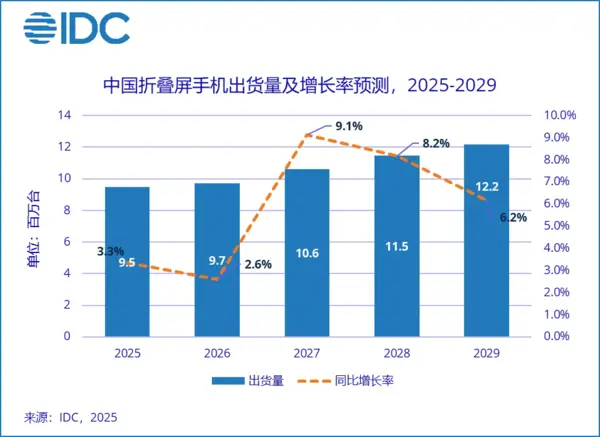 8月26日,IDC最新發佈的手機季度預測報告顯示,2025年全球折疊屏手機市場出貨量預計約為 1,983 萬台,同比增長 6.0%。至 2029 年,全球折疊屏手機出貨量預計將接近 2,729 萬台,五年複合增長率達 7.8%。