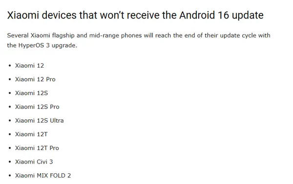 根據 Xiaomi Time 的公布名單,小米數字系列和 MIX 系列中的多款旗艦機型,包括小米 12、小米 12 Pro、小米 12S、小米 12S Pro、小米 12S Ultra、小米 12T、小米 12T Pro、小米 Civi 3 以及小米 MIX FOLD 2 等,均無法升級至 Android 16。