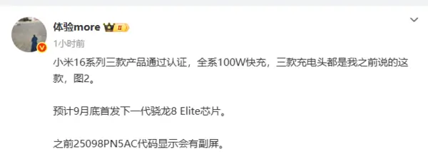 8月28日,有數碼博主透露,小米16系列的三款新機已通過認證。從認證信息中可見,這三款新機均支持100W快充技術。