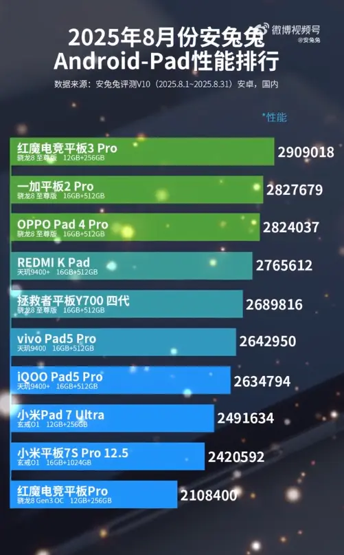 9月3日,安兔兔發佈了8月份的安卓平板性能榜。榜單顯示,小米 Redmi K Pad 以276,5612分的成績排名第四。
