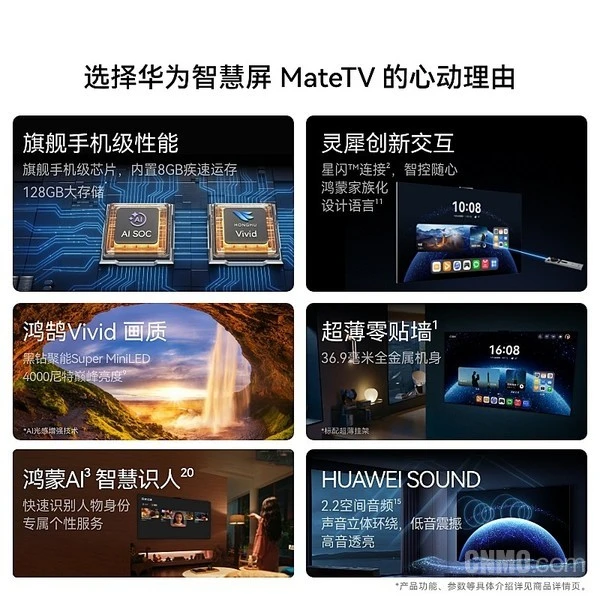 華為智慧屏MateTV搭載了旗艦手機級芯片,擁有8GB RAM和128GB存儲。自研獨立畫質芯片“鴻鹄Vivid”性能較前代提升300%,並配合峰值亮度達4,000尼特的Super Mini LED黑鑽屏,保障了專業級的音畫表現。此外,AI光感增強技術能夠還原真實光影,滿足從觀影到創作的多元需求。華為智慧屏MateTV還擁有36.9mm的超薄全金屬機身,標配超薄掛架,可實現“零貼牆安裝”。