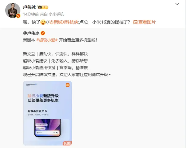 9月5日,小米集团合伙人及总裁卢伟冰确认,小米下一代旗舰小米16系列将提前发佈。