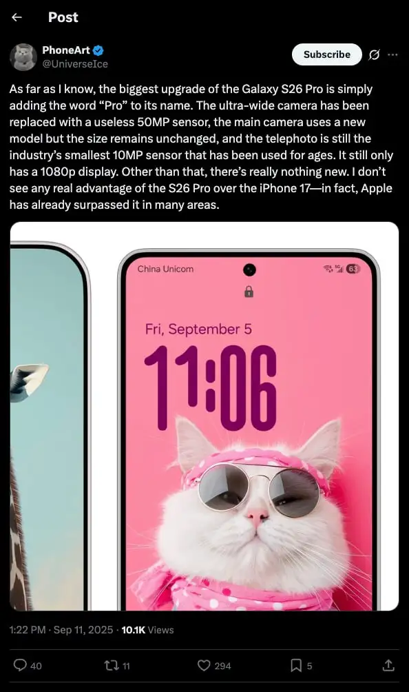 在社交媒體平台 X 上,@UniverseIce 表示,Galaxy S26 Pro 將在主鏡頭上有所改進,並將配備 5,000 萬像素的超廣角鏡頭,取代前一代的 1,200 萬像素鏡頭。除此之外,設備的其他方面,包括 1,000 萬像素的長焦鏡頭和 Full HD+ 分辨率的顯示屏,將與現有型號保持一致。由於升級幅度不大,這位爆料人認為 Galaxy S26 Pro 不值得冠以 Pro 標籤,但這種觀點並不完全正確。