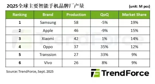 在前六大手機品牌中,它們共同占據了約80%的市場份額。具體來說,Samsung以5,800萬部的產量穩居榜首,雖然與上一季度相比減少了5%。Apple在此期間的產量為4,600萬部,占比15%,同樣較上一季度下降9%,位列第二。值得一提的是,Apple的產量年增幅達到4%,這主要得益於上半年新機型iPhone 16e的優異市場表現。
