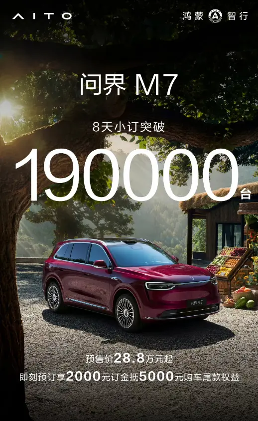 9月12日,鸿蒙智行最新數據顯示,全新問界 M7 自9月5日啟動預售以來,市場反響空前熱烈,小訂單量在8天內突破19萬份,持續刷新國產新能源 SUV 預售紀錄。早前,該型號在啟動預訂僅10分鐘時,小訂單數量即突破2萬台,1小時內突破10萬台,6小時內累計達13萬台,24小時內超過15萬台。