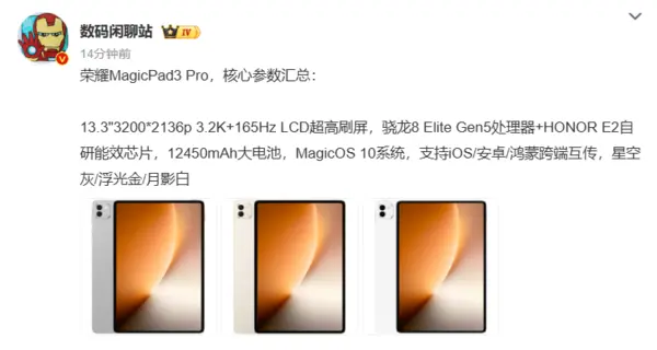 9月29日,荣耀商城公布了荣耀MagicPad 3 Pro平板的詳細配置。根據商品詳情,新平板內置一塊 12,450 mAh 超大電池容量的青海湖電池,並自稱為“全球首款搭載第五代驍龍 8 至尊版移動平台的平板”,提供星空灰、浮光金、月影白三款配色。