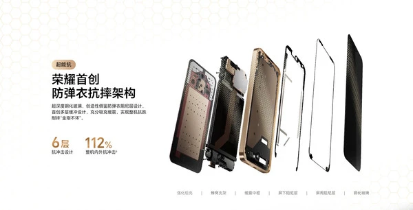 Honor X70 在防摔能力方面也有顯著提升,將防摔高度提升至 2.5 米,達到目前行業的最高水平,適合高空作業、跑步、騎行、攀爬等易跌落場景。此外,該機在邊框、背板和屏幕等多個部位使用了吸能材料,並通過高強度緩衝結構實現全角度跌落防護,成為行業內首款不挑落地角度的防摔手機。