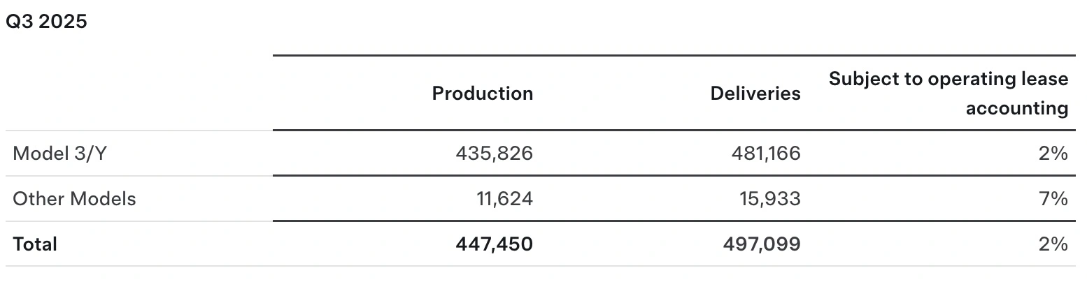 根據 Tesla 的 Q3 2025 車輛交付及生產報告,該公司的主要數據來自其大眾市場系列。Model 3 轎車和 Model Y 跨界車在本季度共生產了 435,826 輛,交付了 481,166 輛。考慮到 Model 3 和 Model Y 仍屬於高端定價的車型,且面對著眾多價格更為實惠的競爭對手,這一數字相當令人印象深刻。其他車型,包括 Model S、Model X 和 Cybertruck,則貢獻了 11,624 輛的生產和 15,933 輛的交付。Tesla 還提到,2% 的交付屬於租賃會計。