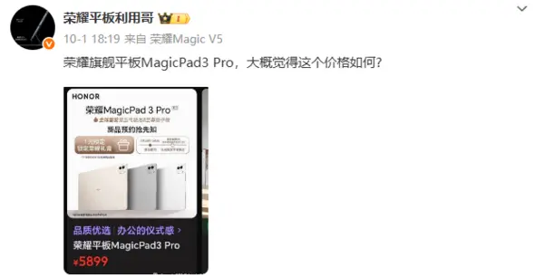 此外,Honor 平板與 IOT 產品領域總經理在社交平台上曾就 Honor 旗艦平板 MagicPad 3 Pro 的價格與網友互動,配圖顯示價格為 5,899 元人民幣,約 HK$ 6,417。