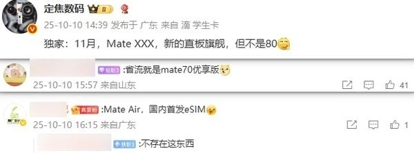 此外,值得關注的是,上述博主也提到,除了Mate 80系列外,華為還計劃在11月推出一款定位特殊的直板旗艦機型。這款機型並非Mate 80系列成員,可能主打輕薄設計或eSIM功能,甚至提供2TB存儲版本,以補充高端市場的布局。目前其具體配置尚未公開,但業界推測可能與Mate 80系列同步發佈,進一步豐富華為的旗艦產品線。