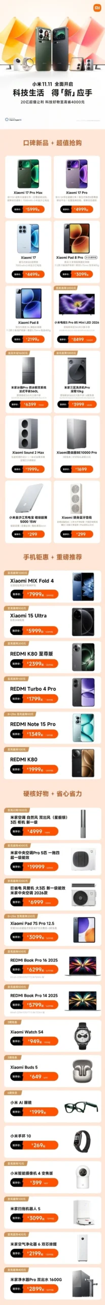 10月13日,小米官方正式宣布“小米雙11”活动正式开启。官方信息显示,此次参与优惠的商品覆盖全品类,并且单品最高优惠高达 4,000 元。