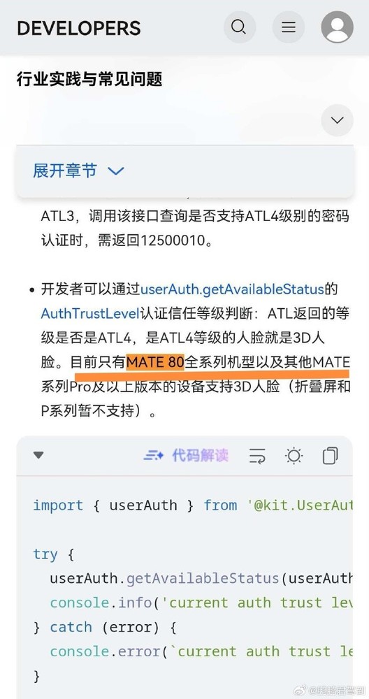 近日有數碼博主爆料,在華為官方開發文檔中發佈了有關 3D 人臉的相關開發指引,暗示華為 Mate 80 標準版也將支持 3D 人臉解鎖。文檔指出,目前只有 Mate 80 全系列機型以及其他 Mate 系列 Pro 及以上版本的設備支持 3D 人臉(折疊屏和 P 系列暫不支持)。按照該說法,如果 Mate 80 標準版能夠用上 3D 人臉解鎖功能,那麼也將是 Mate 歷史上最為強大的標準版,同時也是華為首次將 3D 人臉識別下放給 Mate 標準版機型。