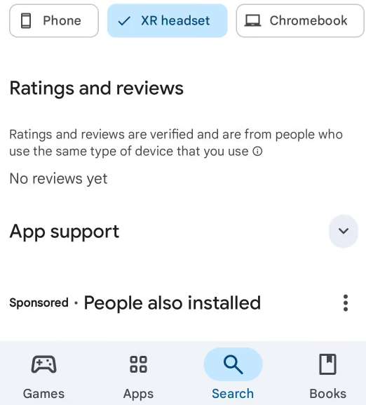 當用戶進入 Play 商店的應用詳情頁面並向下滾動時,將會看到一個橫向排列的支持設備類型列表。用戶只需點擊任一設備類型,即可查看該應用在相應設備上的評分與用戶評價。現在,這個列表中已新增了“XR 頭顯”選項。