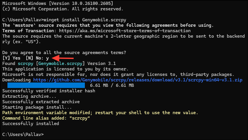 - 根據用戶的網絡連接情況,Scrcpy 的安裝可能需要一些時間。Scrcpy 還需要安裝 Android 設備橋 (ADB)。當它要求用戶授權安裝時,按 Y 鍵。
