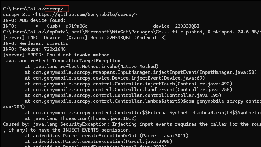 - 現在用戶可以通過 USB 線將手機和電腦連接。在完成此操作後,按照前面的方法打開命令提示符,然後在其中輸入 scrcpy 並按 Enter 鍵。