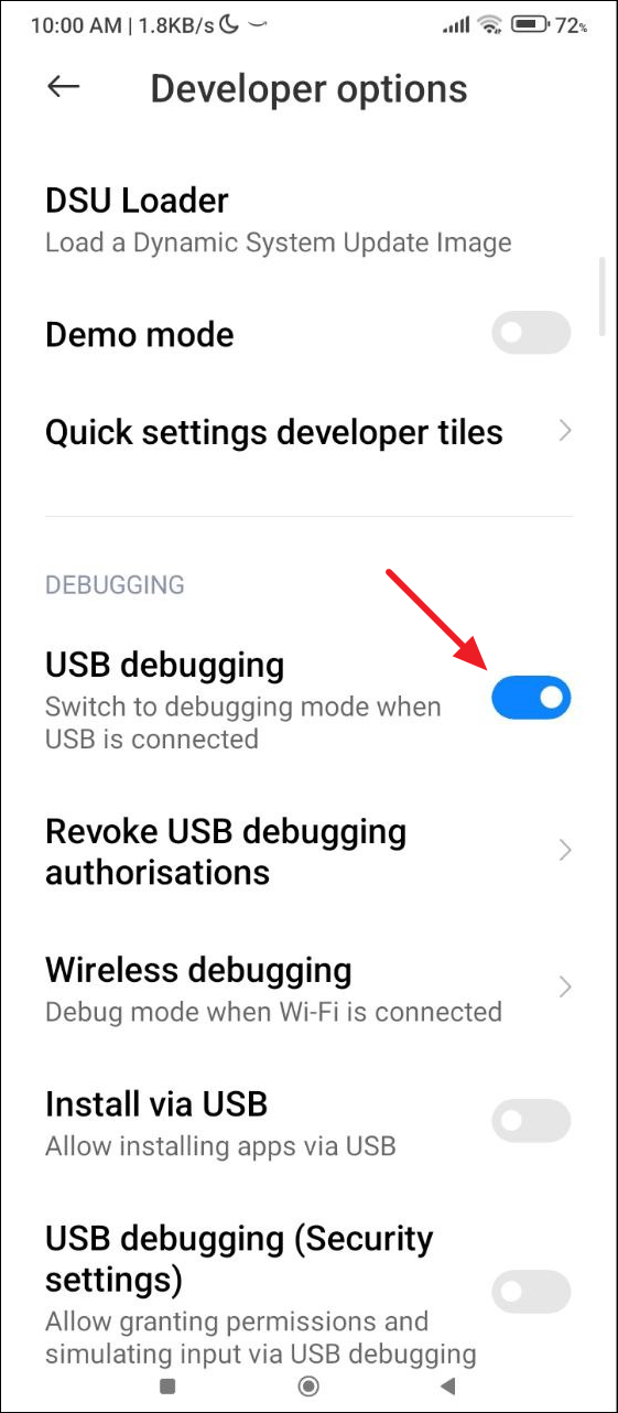 - 進入開發者選項菜單後,打開「USB 調試」。