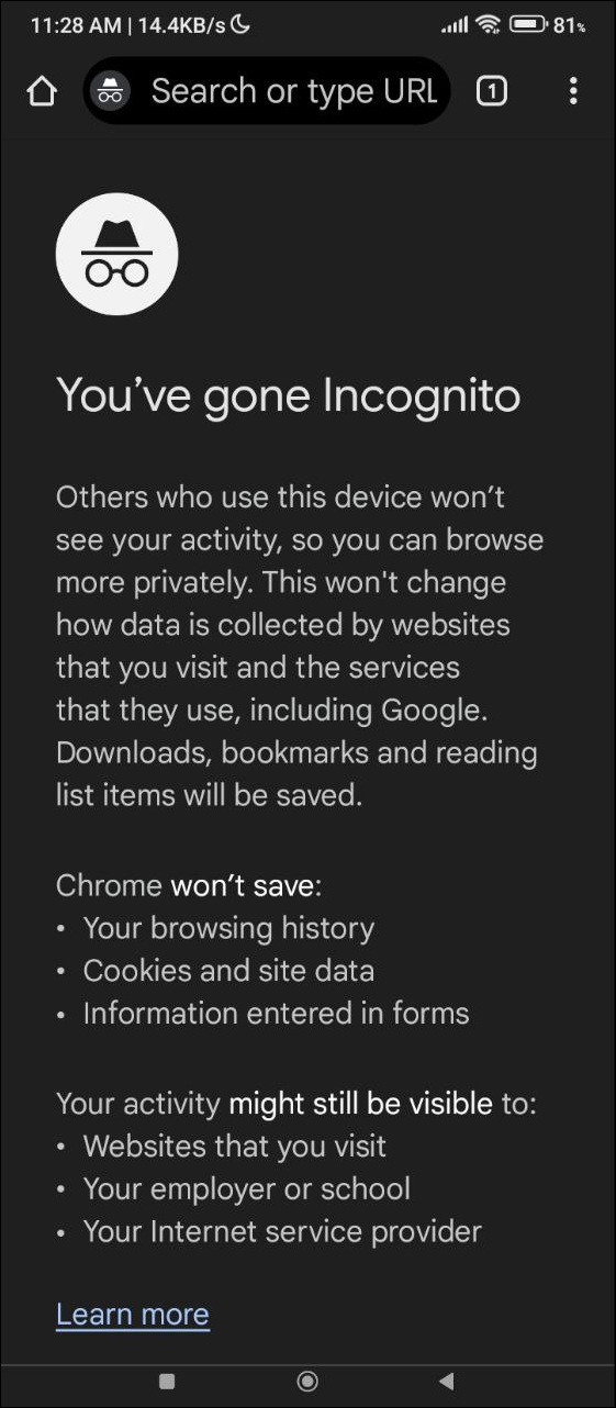 - 現在,在 Chrome 中打開隱私窗口並進行截圖。這樣便能成功截圖,該截圖將出現在手機的相冊中。