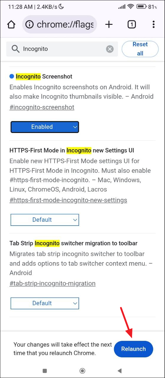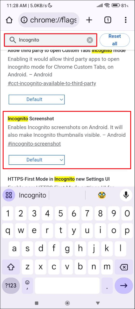 - 在搜索框中輸入 incognito,這將列出所有與隱私模式相關的實驗功能。