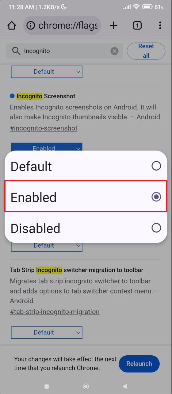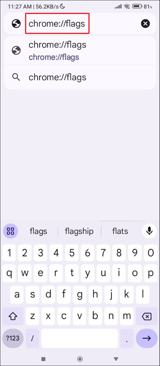 - 在 Android 上打開 Chrome,輸入 chrome://flags,然後轉到列出所有瀏覽器實驗功能的標誌頁面。