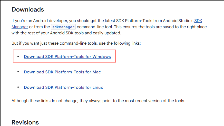 - 前往 Google 平台工具網站,下載適用於 Windows 的工具。