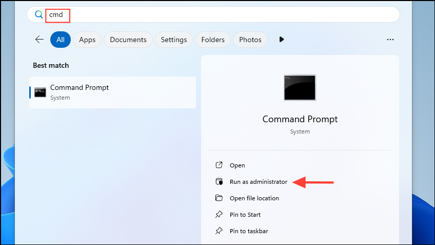 - 打開開始菜單,輸入 cmd,然後點擊「以管理員身份運行」。