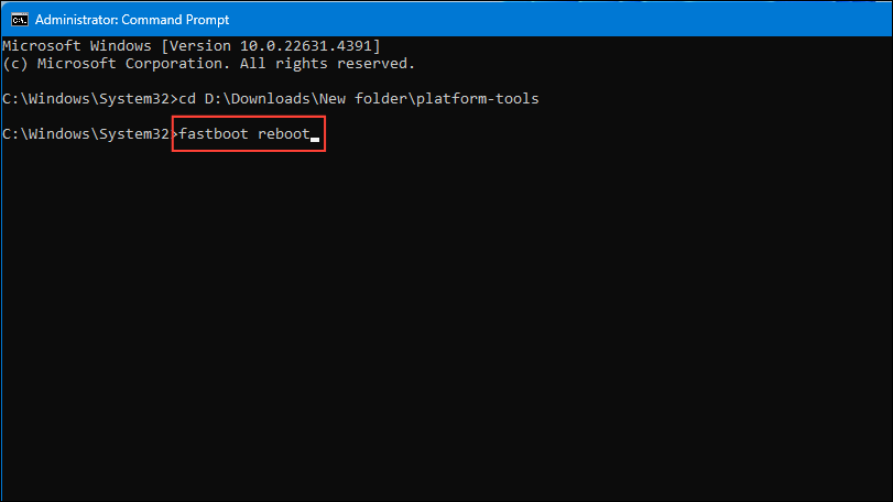- 在命令提示符窗口中輸入 fastboot reboot 來開啟 Android 手機。