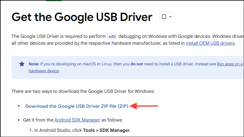 如果電腦無法檢測到 Android 手機,則輸入的快速啟動命令將無法正常運作。這可能是由於驅動程式故障或不相容,因此需要手動下載並安裝 Google USB 驅動包。