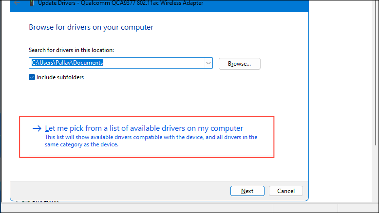 - 接下來,點擊「讓我從計算機上可用的驅動程式列表中選擇」。