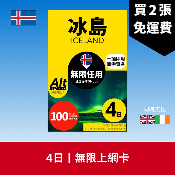 Alt Speed 冰島 4-7天 無限上網電話卡現售 HK$124(原價 HK$189,減 HK$65)。呢款電話卡提供無限數據,使用 Vodafone 網絡,覆蓋全冰島,並且支持英國同愛爾蘭地區,適合轉機旅客使用。