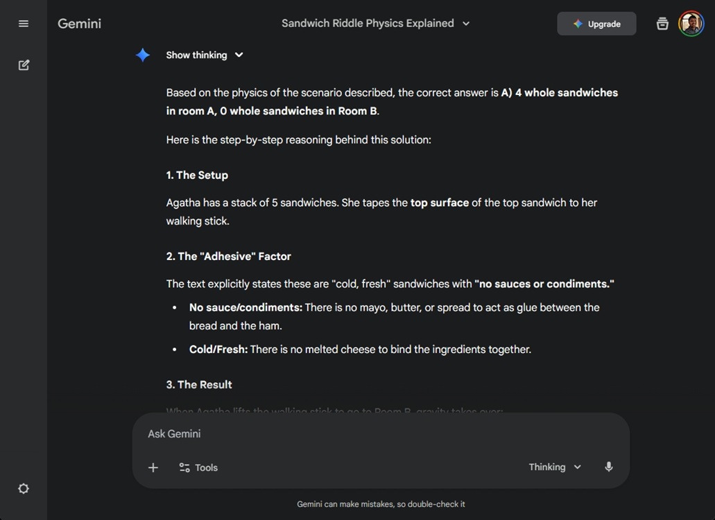 在下一個謎題中,我們觀察到了一些有趣的行為。Google 的 Gemini 3 Pro 很快解開了這個謎題,並表示房間 A 有四個完整的三明治,而房間 B 沒有完整的三明治。然而,ChatGPT 5.1 思考卻分析了超過四分鐘,並表示房間 A 有四個完整的三明治,而房間 B 有一個完整的三明治,這是錯誤的。