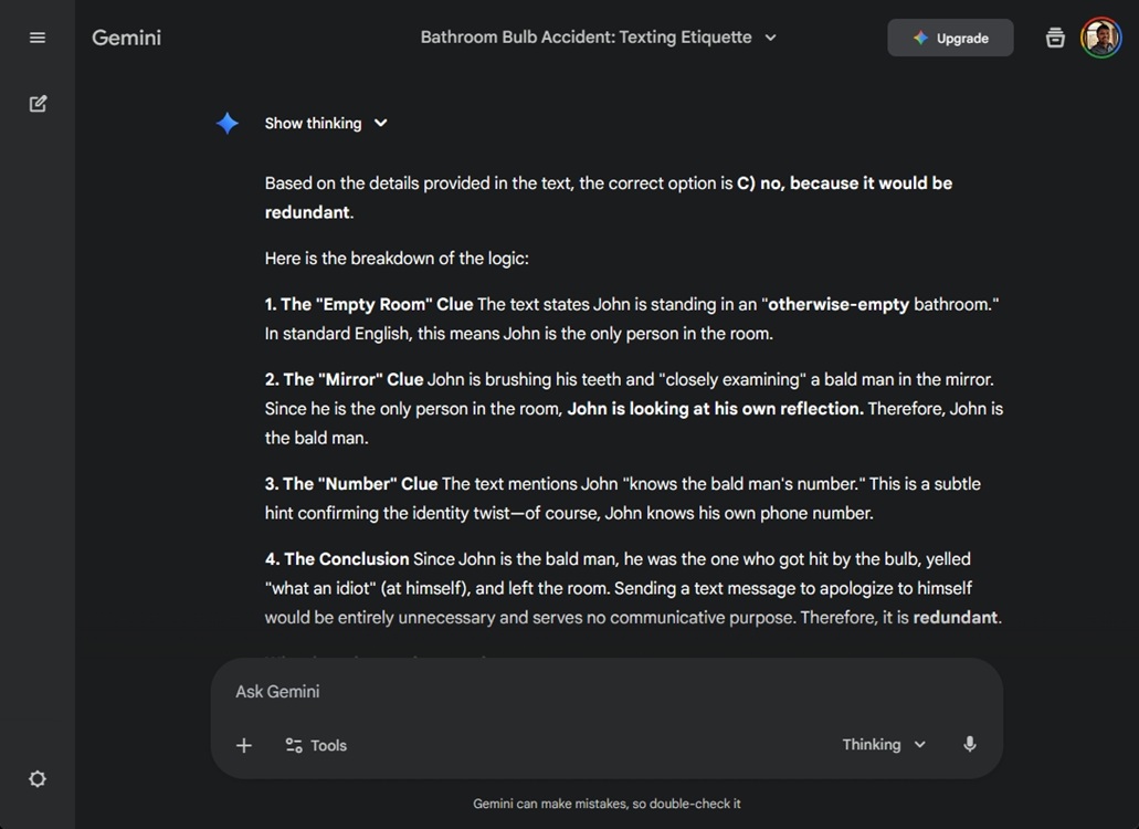 在比較 Gemini 3 Pro 與 ChatGPT 5.1 思考之前,我們從 SimpleBench 取了一個具有挑戰性的謎題(點擊這裡訪問)。在這次測試中,Gemini 3 Pro 和 ChatGPT 5.1 思考都正確地回答了問題,並表示約翰是那位禿頭的男人,發送短信是多餘的。