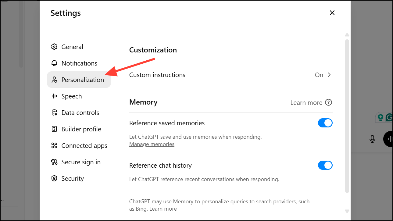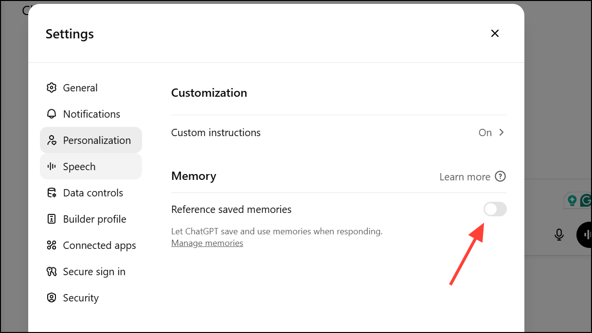 步驟 2:要禁用記憶功能,關閉儲存的記憶參考和/或聊天歷史參考。這樣可以防止 ChatGPT 使用過去的對話來影響未來的回應。